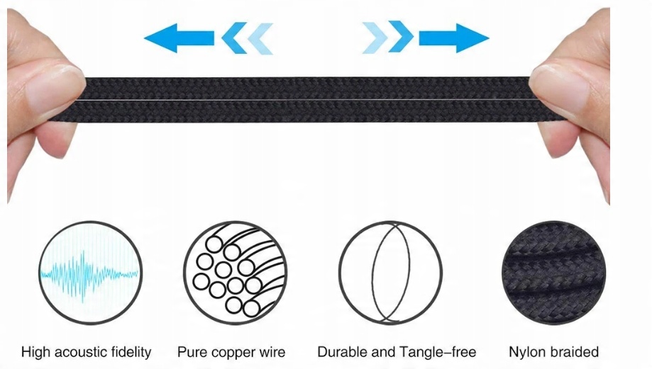 - Wytrzymały przewód w oplocie – zapewnia wyjątkową trwałość, odporność na przetarcia, zużycie oraz rozdarcia.